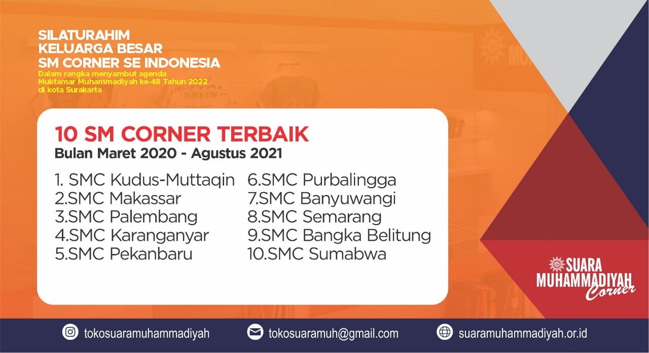 Perjalanan Suara Muhamamdiyah Corner (SM Corner) sejak berdiri tahun 2017 tidak terlepas dari kerja jamaah dan kolaborasi antar warga persyarikatan Muhammadiyah. Begitupula dengan hadirnya SM Corner PDNA Karanganyar yang merupakan satu dari 62 Outlet SM Corner di berbagai daerah di tanah air dan mancanegara. Dalam rangka menyambut agenda Muktamar Muhammadiyah ke-48 Tahun 2022 di Kota Surakarta, SM Corner menyelenggarakan acara Silaturahmi Keluarga Besar SM Corner se-Indonesia. (30/10/2021)