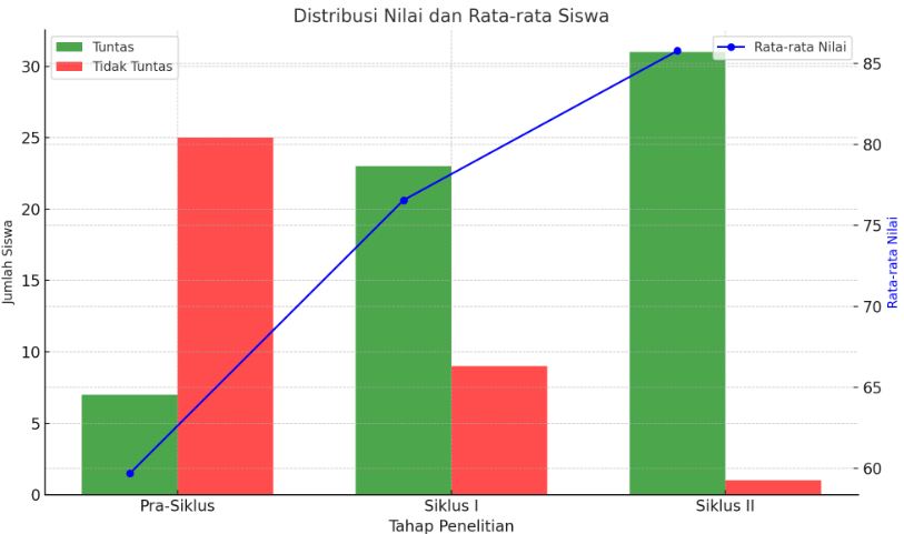 Jika dibandingkan, terjadi peningkatan rata-rata nilai sebesar 9,22 poin dari Siklus I ke Siklus II. Tingkat ketuntasan juga meningkat dari 72% pada Siklus I menjadi 97% pada Siklus II, dengan tambahan 8 siswa yang mencapai KKM. Kendala teknis yang sebelumnya menjadi hambatan pada Siklus I berhasil diminimalkan pada Siklus II, sehingga siswa dapat lebih fokus dalam pembelajaran. Selain itu, penambahan variasi soal, seperti soal analisis dan aplikasi, turut membantu siswa mengasah kemampuan berpikir kritis mereka.