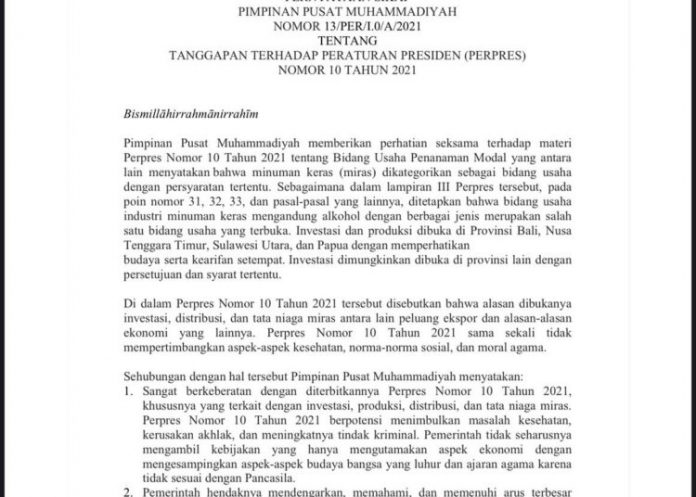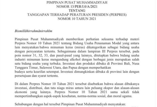 Pimpinan Pusat Muhammadiyah memberikan perhatian seksama terhadap materi Perpres Nomor 10 Tahun 2021 tentang Bidang Usaha Penanaman Modal yang antara lain menyatakan bahwa minuman keras (miras) dikategorikan sebagai bidang usaha dengan persyaratan tertentu. Sebagaimana dalam lampiran III Perpres tersebut, pada poin nomor 31, 32, 33, dan pasal-pasal yang lainnya, ditetapkan bahwa bidang usaha industri minuman keras mengandung alkohol dengan berbagai jenis merupakan salah satu bidang usaha yang terbuka. Investasi dan produksi dibuka di Provinsi Bali, Nusa Tenggara Timur, Sulawesi Utara, dan Papua dengan memperhatikan budaya serta kearifan setempat. Investasi dimungkinkan dibuka di provinsi lain dengan persetujuan dan syarat tertentu.